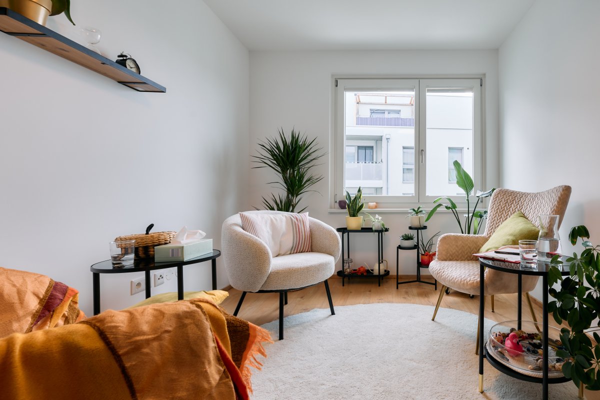 Die Praxis befindet sich in ruhiger, verkehrsarmer Lage. Die Fenster blicken in einen weitläufigen, begrünten Innenhof, wodurch eine helle, sonnige und angenehme Atmosphäre entsteht. Für ein angenehmes Raumklima ist sowohl durch Heizung als auch Kühlung gesorgt. Ein ruhiger geschützter Ort, an dem Sie ankommen, zur Ruhe kommen und ganz Ihren Anliegen widmen können. Der Praxisraum ist barrierefrei erreichbar (ohne Stufen oder Türschwellen) und befindet sich im zweiten Stock eines Neubaus mit Aufzug. Bitte beachten Sie, dass der Sanitärbereich nicht rollstuhlgerecht ausgestattet ist. Die Praxis liegt in Breitenlee, Podhagskygasse 20/Top 25, und ist gut an das öffentliche Verkehrsnetz angebunden. Sie ist in wenigen Gehminuten von den nächstgelegenen Haltestellen erreichbar. Ein reservierter Parkplatz steht leider nicht zur Verfügung.